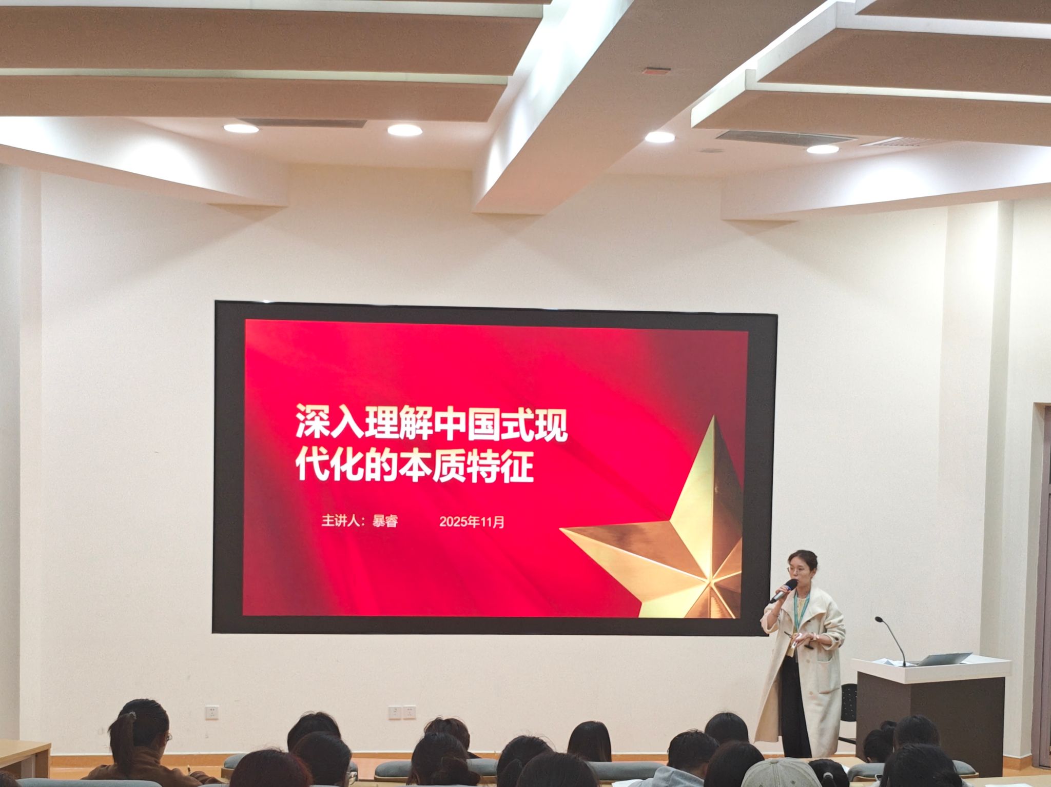 最后,她讲解了“中国式现代化的五大本质特征”:从“人口规模巨大”的独特国情,到“全体人民共同富裕”里“脱贫攻坚一个都不能少”的民生温度;从“物质文明与精神文明相协调”的发展底色,到“人与自然和谐共生”的生态答卷,再到“走和平发展道路”的大国格局——一个个鲜活实例,让抽象的理论长出了“烟火气”,也让同学们读懂了:中国式现代化,是“为中国人民谋幸福、为中华民族谋复兴”的实践路径。