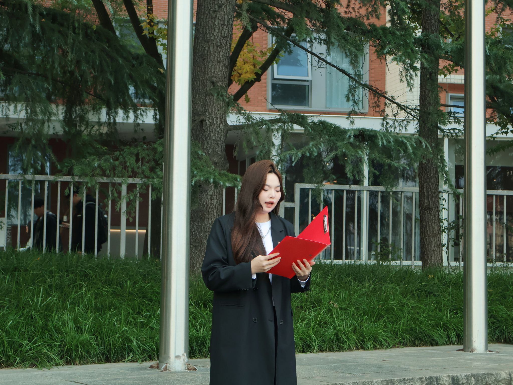 仪式第二项是国旗下演讲环节,预备党员张欣琰同学给大家带来的是关于“八十年风雨铸辉煌 新青年接力续荣光”的主题演讲。她说到,“今年是中国人民抗日战争暨世界反法西斯战争胜利80周年。80年前,无数先辈用14年浴血奋战换来了民族独立的曙光,这份胜利不仅刻在中华民族的史册里,更成为人类追求和平的不朽丰碑,是我们永远不能忘却的记忆。”,她同时提出,“作为新时代的大学生,我们既是历史的见证者,更应是未来的开拓者。我深知肩上扛着的不只是书本和学业,更是时代赋予的责任。我们要以精神为魂,做有担当的奉献者。抗战精神不是陈列在博物馆里的展品,而是融入我们血脉的力量。青年党员的担当,体现在一个个具体行动中。”她真切的发言内容引发了现场师生的强烈共鸣。