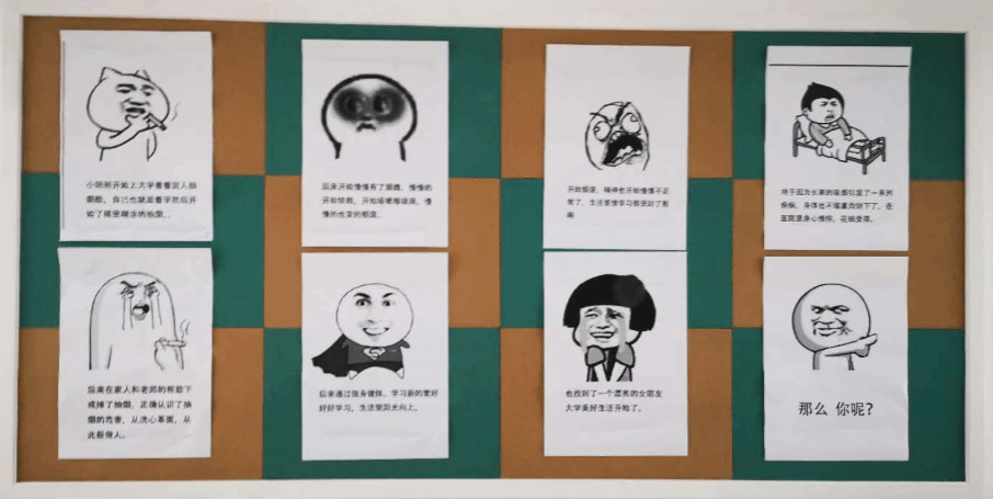 刘博洋:我们楼层充分利用软木板,以控烟知识宣传为主题进行宣传,内容主要宣传远离烟草的危害,养成健康的生活方式和卫生习惯,以健康的体魄面对生活和工作。大学生吸烟这一行为无疑对身体健康埋下地雷,还会让身边的人吸到“二手烟”,所以我们应自身营造无烟氛围。大学生是祖国新一代的支撑,是民族的希望,国家的未来,我们要健康成长,坚决抵制不良诱惑,为了身边的同学朋友,为了爱我们的父母,要远离烟草,共创无烟校园,使校园更美好。也希望越来越多的人加入拒烟行列,倡导健康。