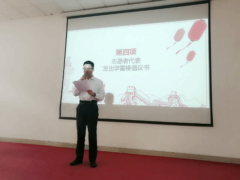 启动仪式接近尾声,第一青年社区分党委书记张成同志向志愿者授旗,同时也是向我们发号了践行雷锋精神的施令。