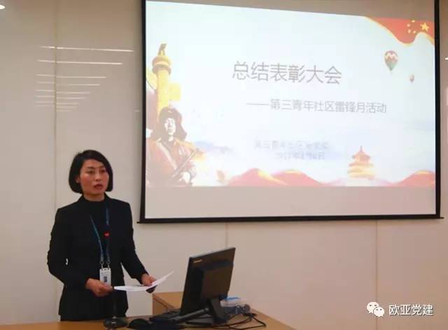 本次大会由第三青年社区分党委组织委员王树民同志主持。会上分党委副书记张爱荣同志对本次雷锋月活动进行总结。本次活动主要包括雷锋图片展、签名活动、节约水电我有责、雷锋精神读书分享、观看《雷锋》电影等内容,是雷锋精神理论联系实际的一次有效结合。分党委老师和学生共计1100余人参与。其中“节约水电我有责”活动成效最为显著,活动开展的3周内,共关闭了537个长明灯,10个空调,16个卫生间长流水源,18个教室多媒体,若干机房电脑和若干教室门窗,在一定程度上节约了我校的公共资源,让雷锋精神在第三青年社区、在欧亚得到发扬。