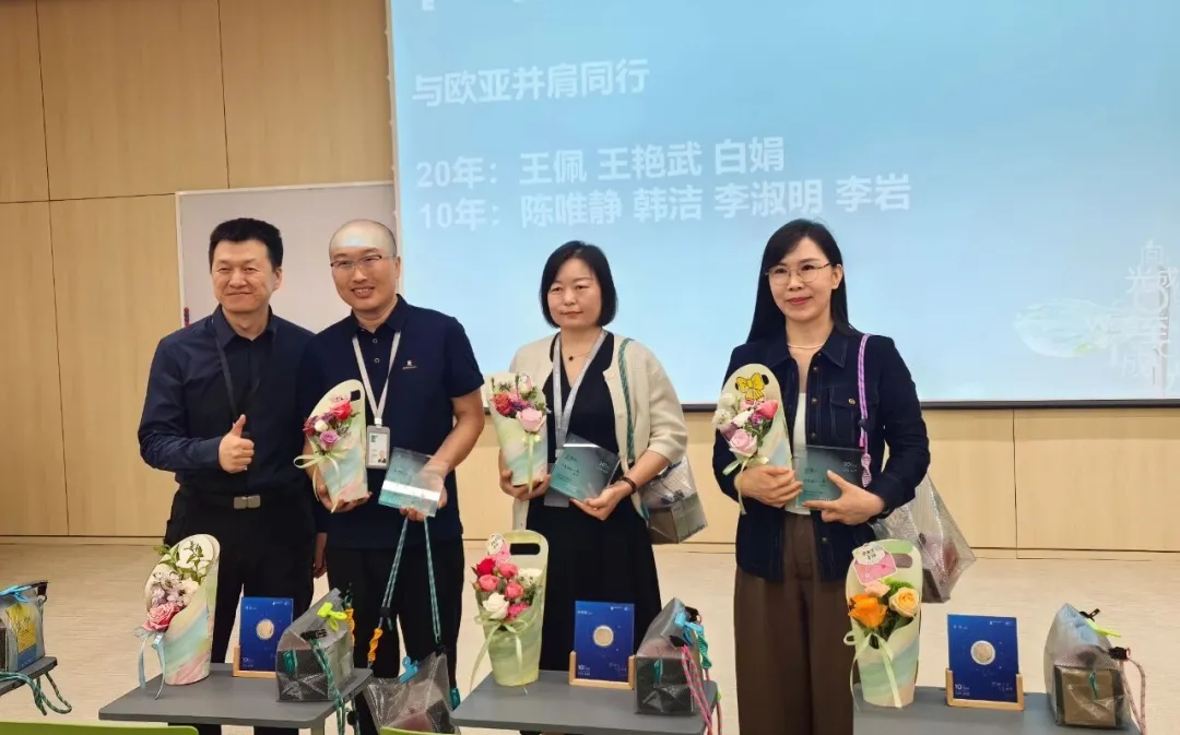 随后,活动进入温情与荣誉交织的时刻——学院为与欧亚并肩同行满20年及满10年的员工举行了隆重的纪念欢庆仪式。这些教职工将宝贵的青春年华奉献给了学院的发展,见证了学院的成长与壮大。学院党总支向这些长期忠诚奉献的教职工表达了最衷心的感谢,并颁发了纪念品,他们的坚守与付出是学院最宝贵的财富,是全体师生学习的楷模。