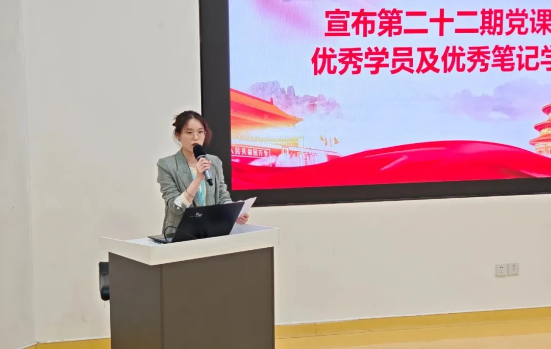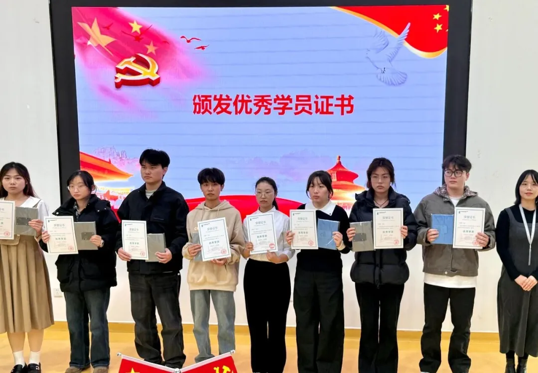 分党委副书记张爱荣首先宣读本期培训班结业决定,她充分肯定了学员们在培训期间的优秀表现,并向顺利完成学习任务的学员表示祝贺。紧接着,分党委组织委员暴睿宣布优秀学员及优秀笔记学员名单。在热烈的掌声中,获奖同学依次上台,张倩、赵锦瑶两位老师为他们颁发了证书与纪念品,这份荣誉成为了同学们“学思践悟”的生动见证。