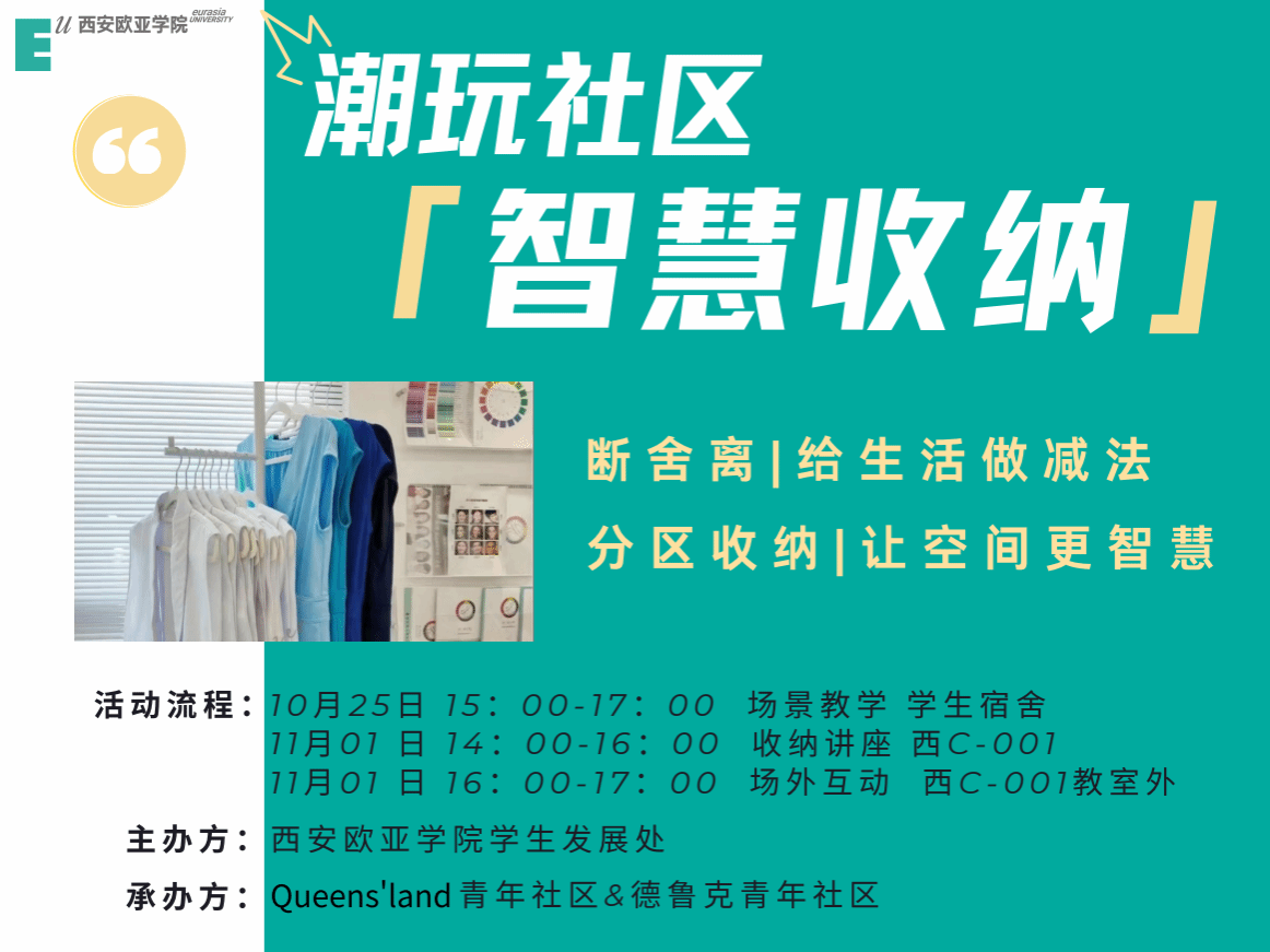 为践行 “青年社区共享价值观”,帮助同学们树立整理理念,掌握收纳技能,养成整洁习惯,提升生活品质,2023年10月25日和11月1日 Queens’land青年和德鲁克青年社区联合开展了“潮玩社区,智慧收纳”系列活动,全校200余名同学参与了此次活动。