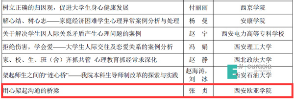 为了展示高校辅导员工作的优秀成果,交流推广先进经验,省委高教工委在我省高校中开展了第二届辅导员优秀工作案例评选活动。日前,在2016年陕西省辅导员优秀工作案例评选活动中,我校张贞老师的案例《用心架起沟通的桥梁》在全省高校215个参赛作品中脱颖而出,荣获了优秀奖。