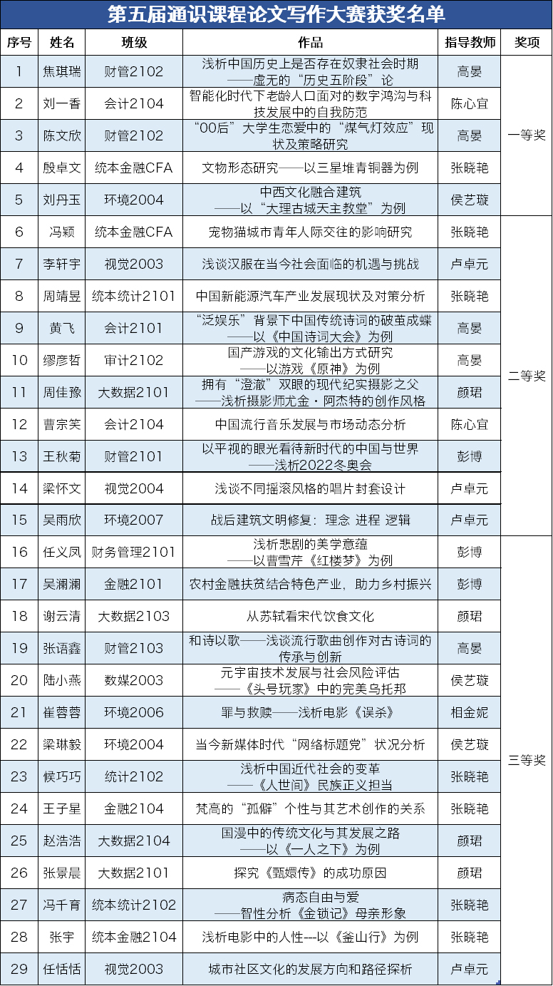 7月12日,bevictor伟德国际1946官网第五届通识课程论文大赛圆满落幕,经过持续一个学期的初赛、复赛和决赛三轮评比,29名同学的作品在2800余份作品中脱颖而出,分获一、二、三等奖。获奖名单如下: