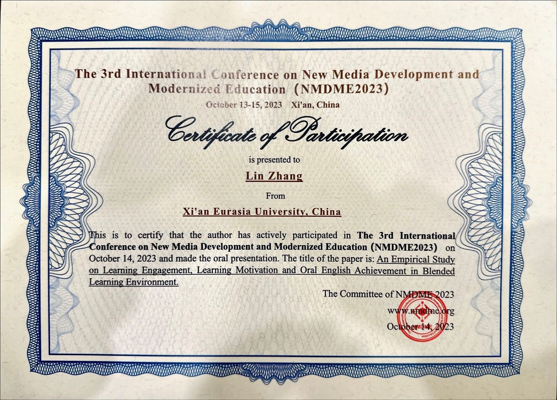 为了进一步提升我校的整体科研实力,着力打造一支国际化教学科研队伍,我校一直以来鼓励教师参加学科领域内国际性和全国性高水平学术会议并进行学术交流。2023年10月15日,我校职业教育学院教师张林应邀参加了The 3rd International Conference on New Media Development and Modernized Education 国际学术会议(简称NMDME),并作题为“An Empirical Study on Learning Engagement, Learning Motivation and Oral English Achievement in Blended Learning Environment”(混合学习环境下学习投入、学习动机与英语口语成绩的实证研究)的英文口头学术报告。其报告论文视角新颖、内容丰富,得到了与会专家学者的认可。