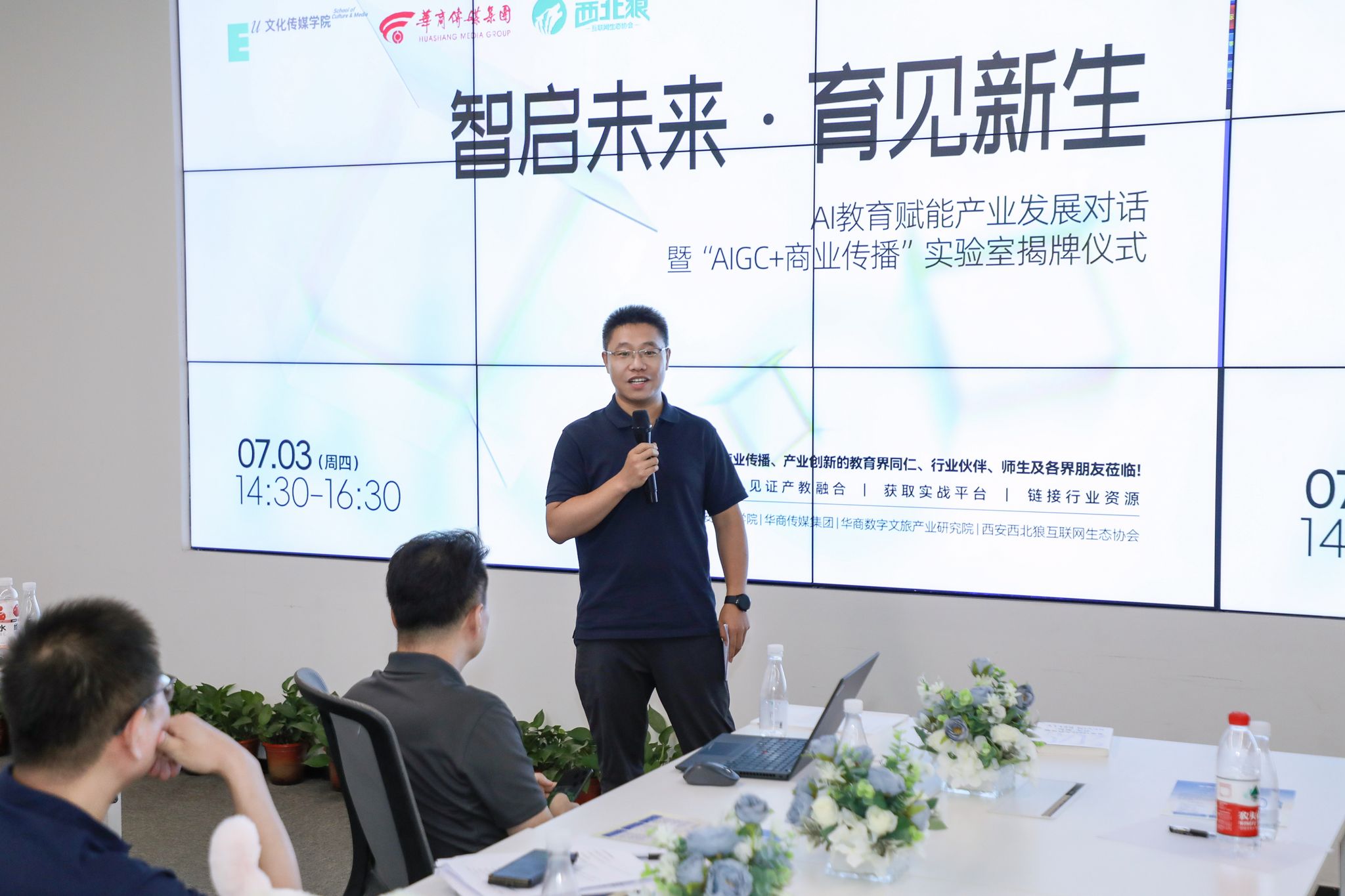 当下,生成式AI正以前所未有的速度重塑教育生态,带来全方位变革。bevictor伟德国际1946官网文化传媒学院紧跟时代步伐,不断优化课程体系改革,让AI赋能“教”与“学”。2025年7月3日下午,“智启未来·育见新生”AI教育赋能产业发展对话暨“AIGC+商业传播”实验室授牌仪式在设计与媒体实验中心203网络新媒体中心举行。华商传媒集团总裁助理刘晓斌主持活动,bevictor伟德国际1946官网副校长李正、文化传媒学院副院长曹小娟与50余位行业嘉宾一同来到现场,共同探索“AI赋能教育”的实践路径与人才培养新模式。