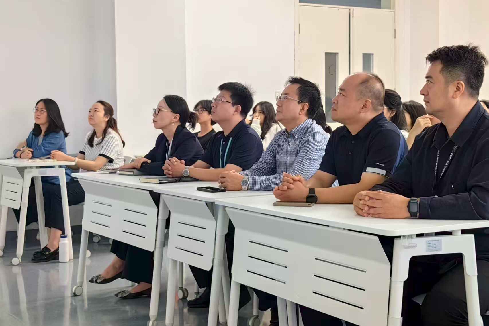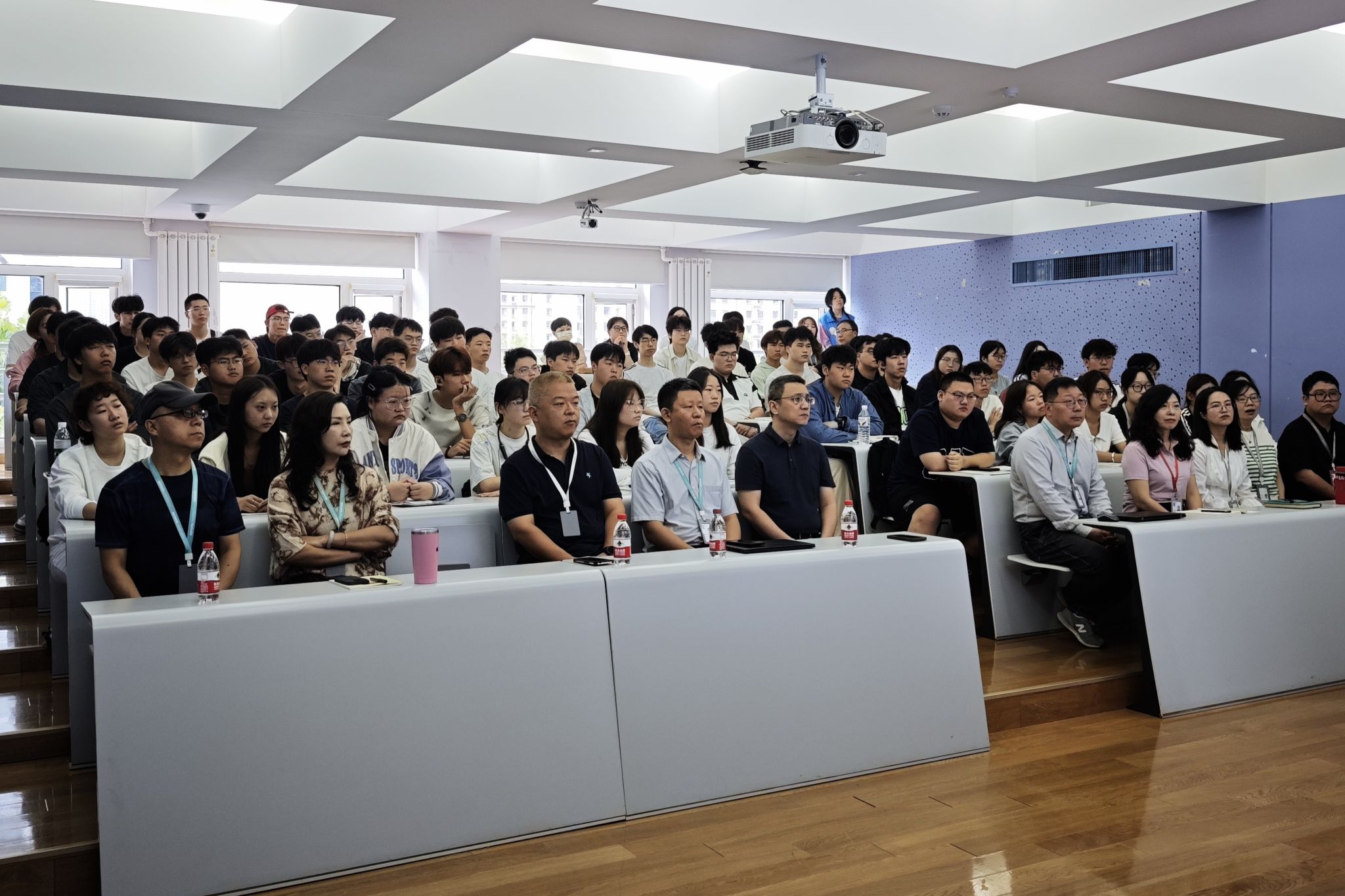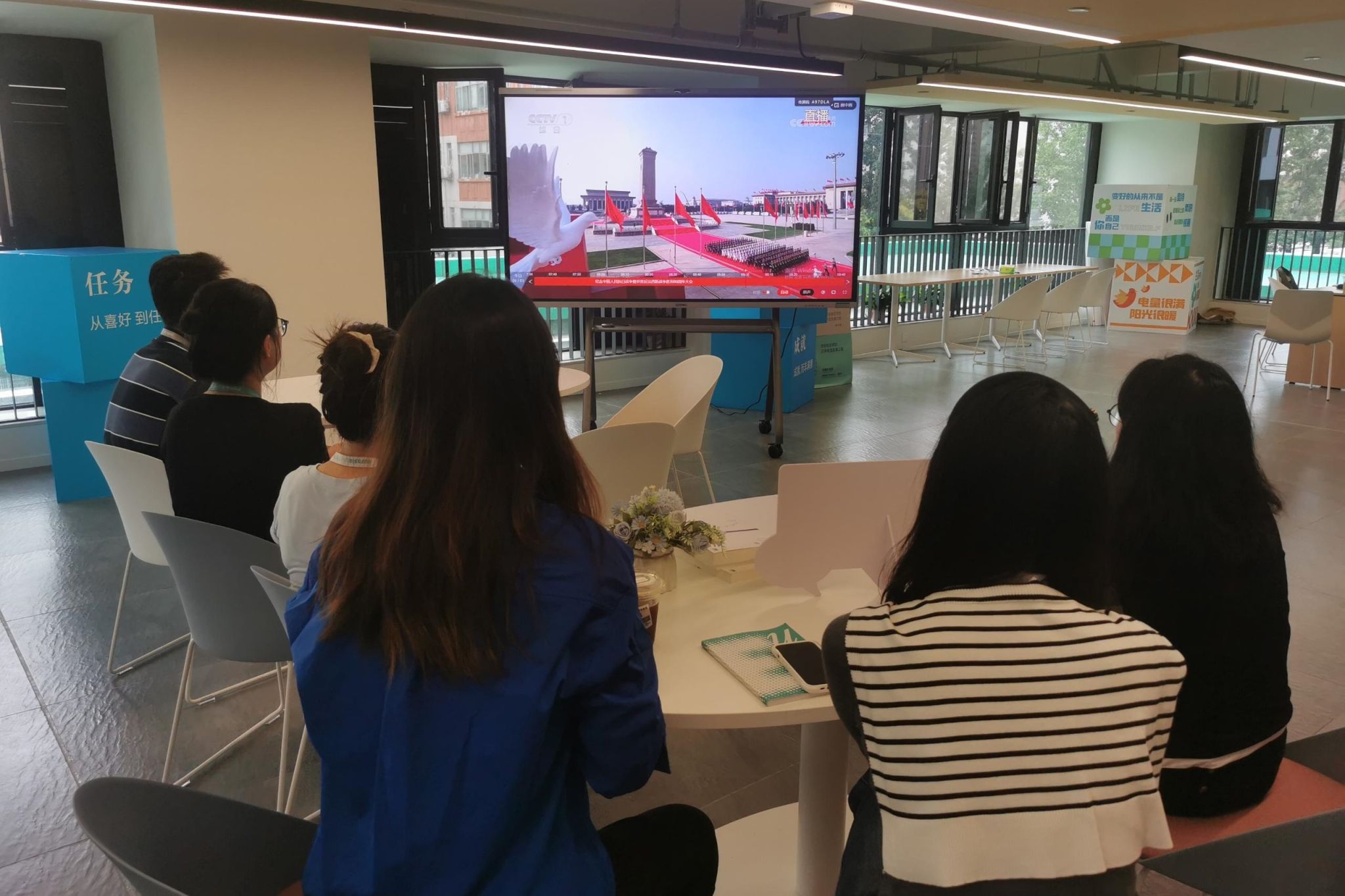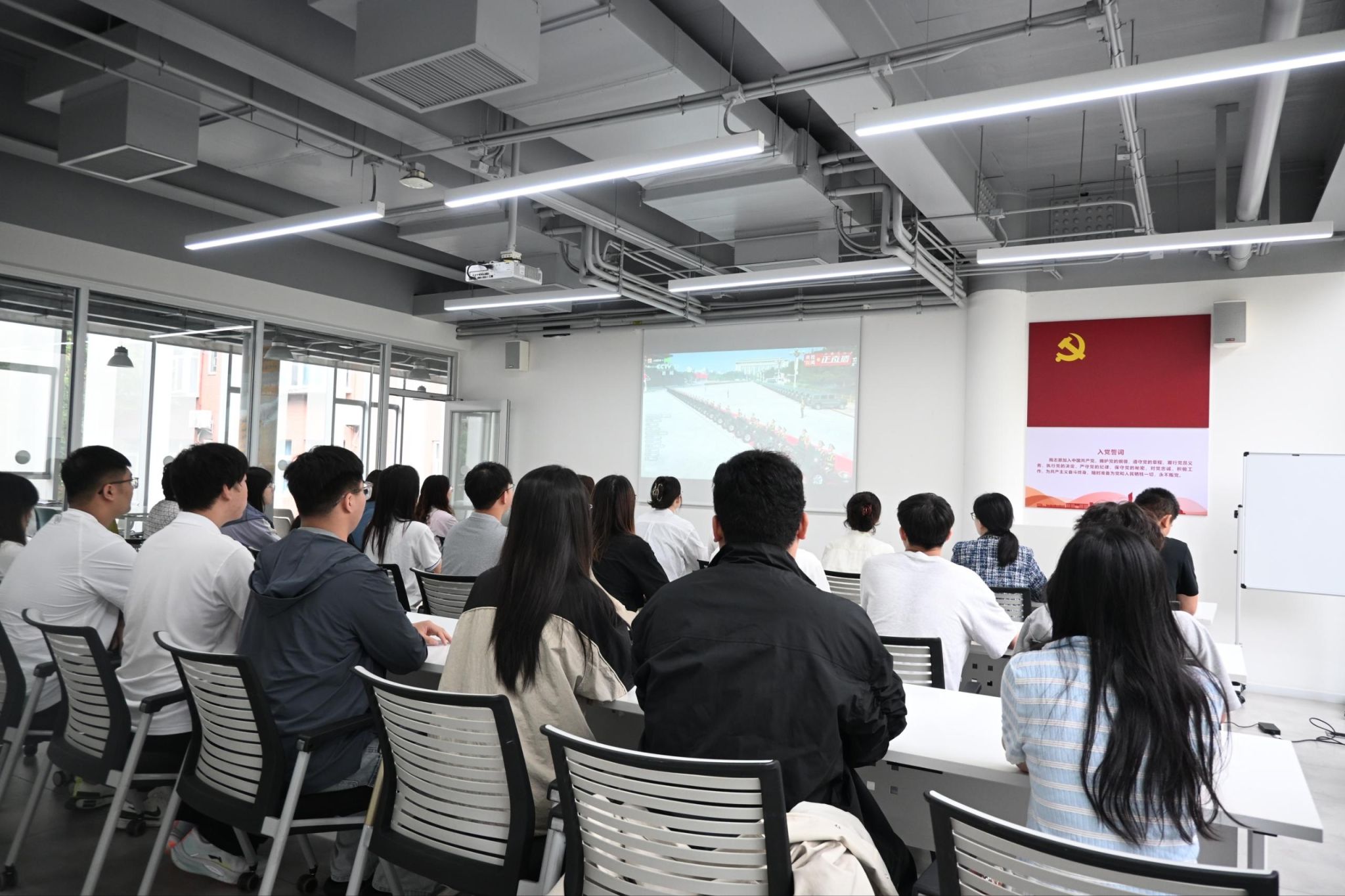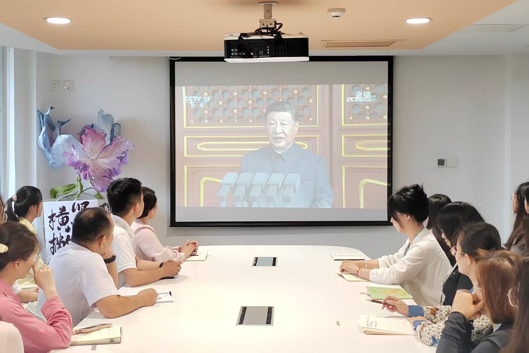 学校党政领导与师生共同观看大会盛况
