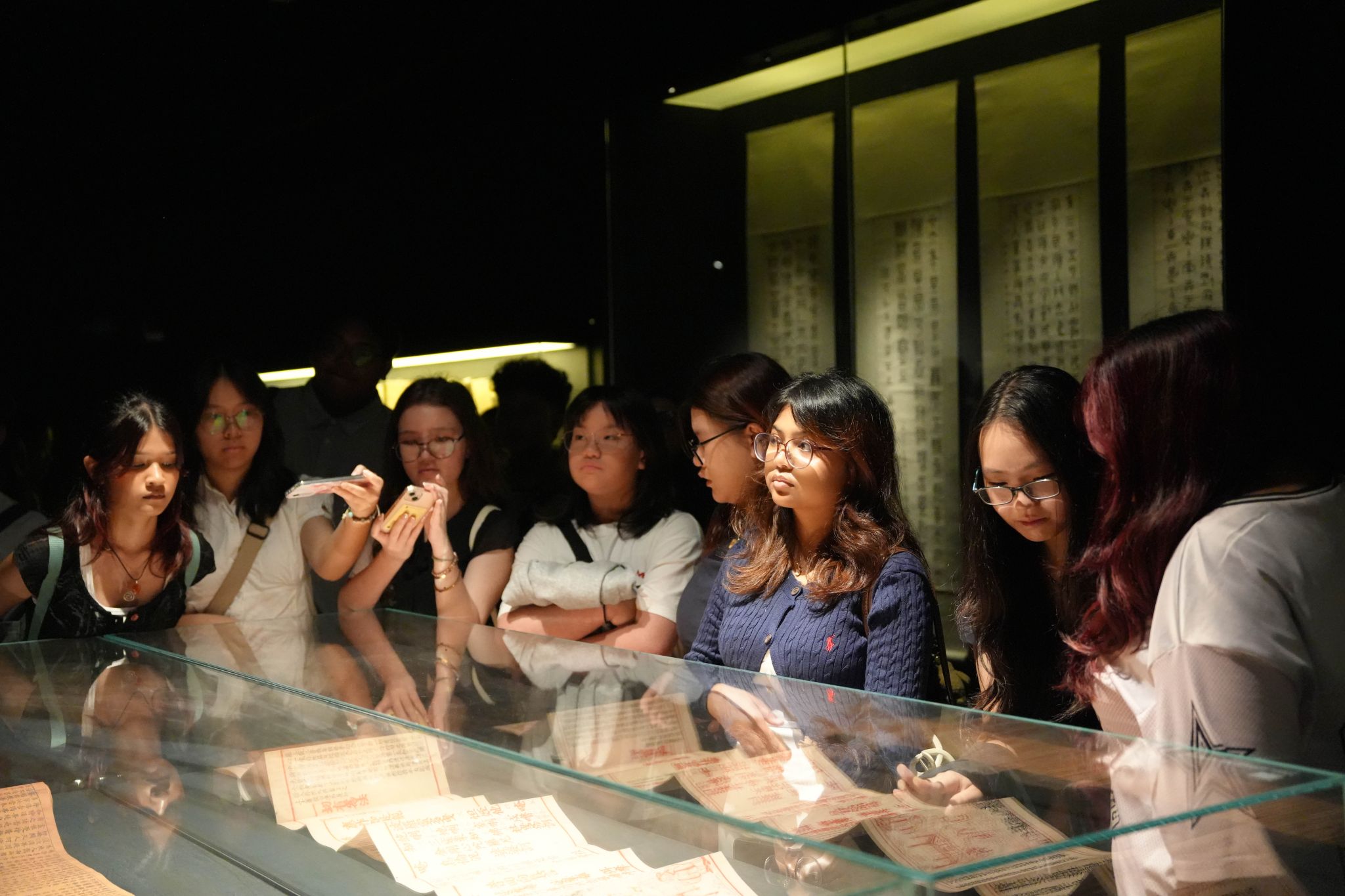 师生们缓缓前行,眼神中满是惊叹与崇敬。他们在一件件展品前驻足良久,那泛黄的书卷、陈旧的照片、饱含岁月痕迹的教具,无一不像是时光碎片,拼凑出学校波澜壮阔的发展画卷。在一个展示学校早期办学成果的展柜前,一位学员用不太流利的中文说到:“这些珍贵的典藏,就像是一座座历史的丰碑,见证了无数的梦想与奋斗。” 他们频频驻足,不仅为学校清晰的办学理念与蓬勃的发展历程所触动,更对欧亚一路走来的积淀与追求表达由衷赞叹——这是一所大学与时代同频、以教育筑梦的生动见证。