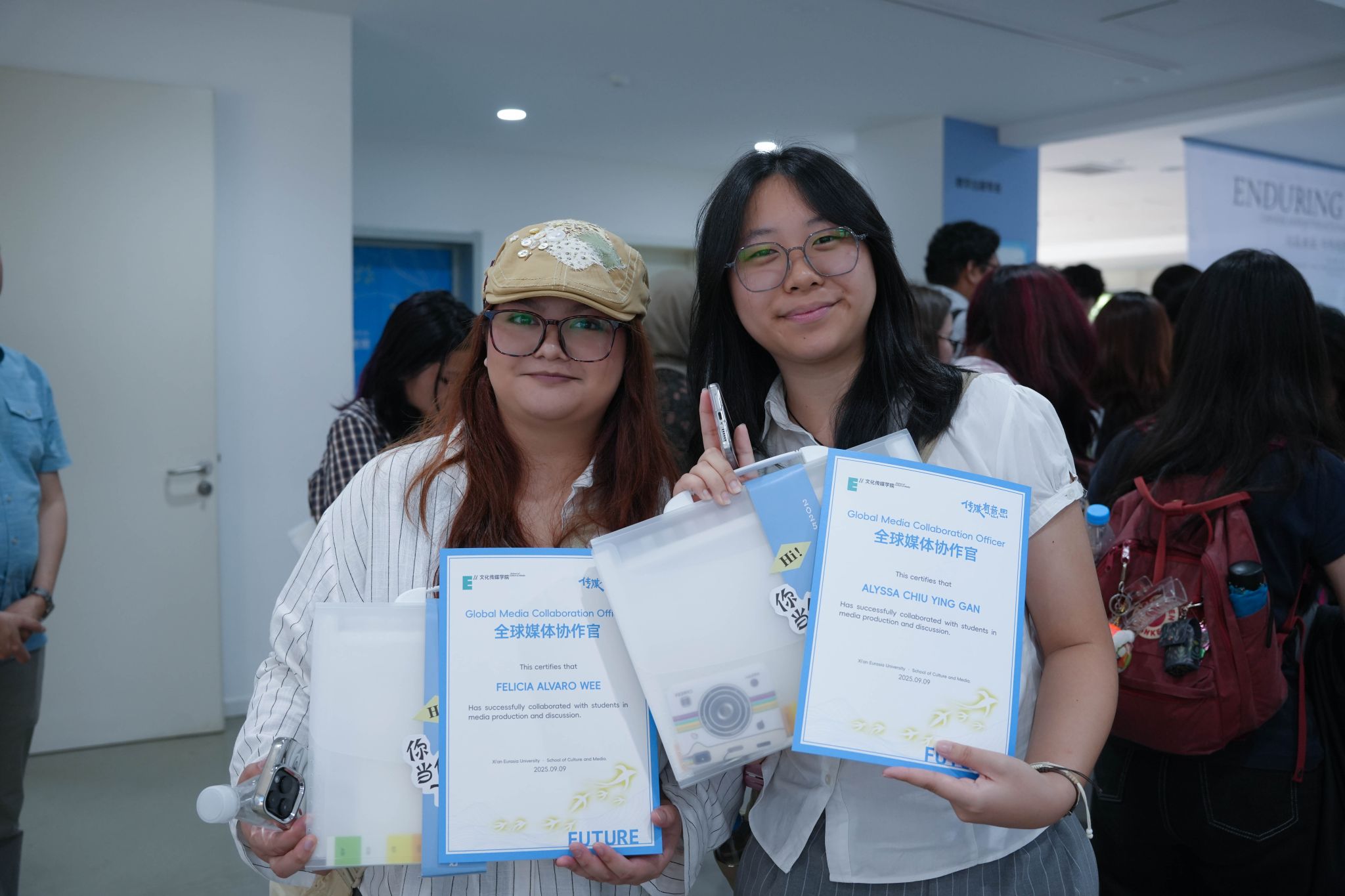 活动尾声,两校师生在多功能摄影棚共同拍摄纪念合影,文化传媒学院为参与此次工作坊的77名学生颁发“Global Media Collaboration Officer(全球媒体协作官)”认证证书。该认证不仅是对学生专业能力的肯定,更标志着两校青年交流长效机制的建立。