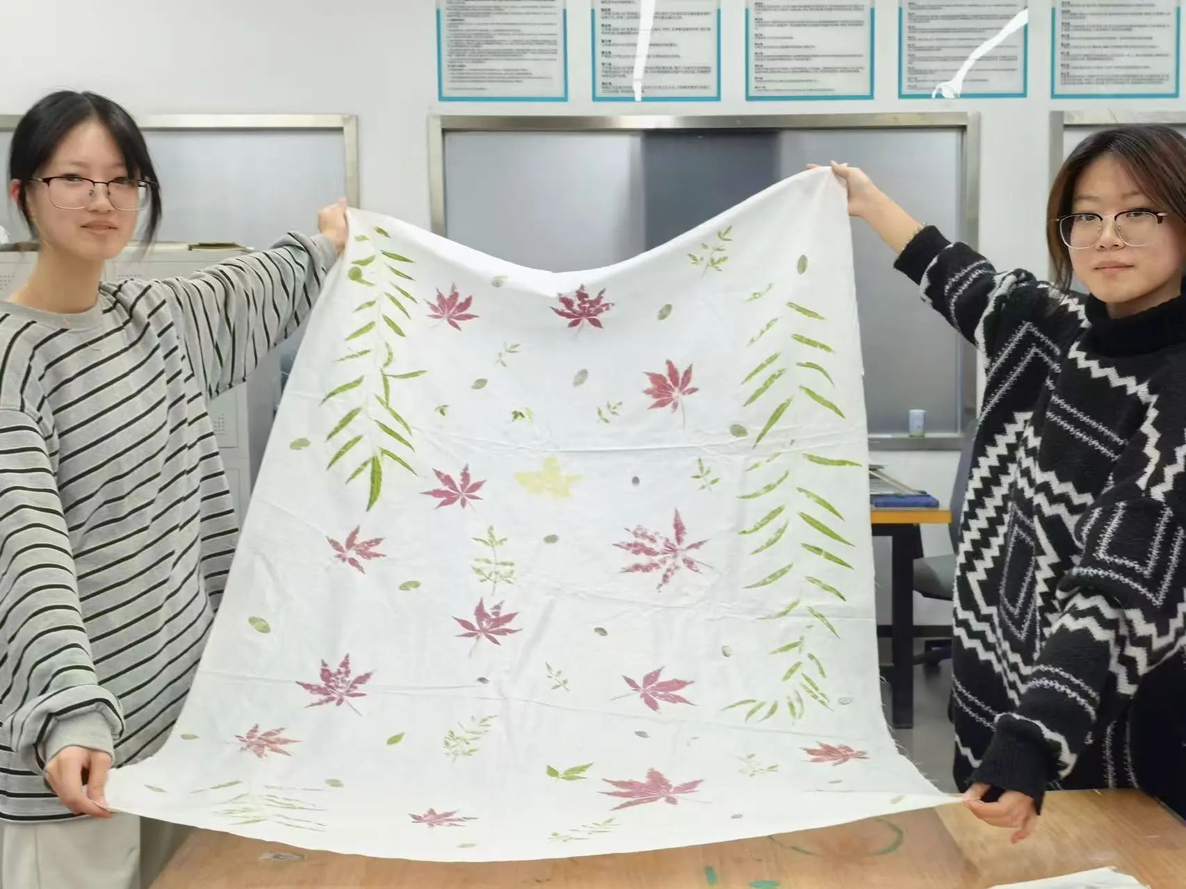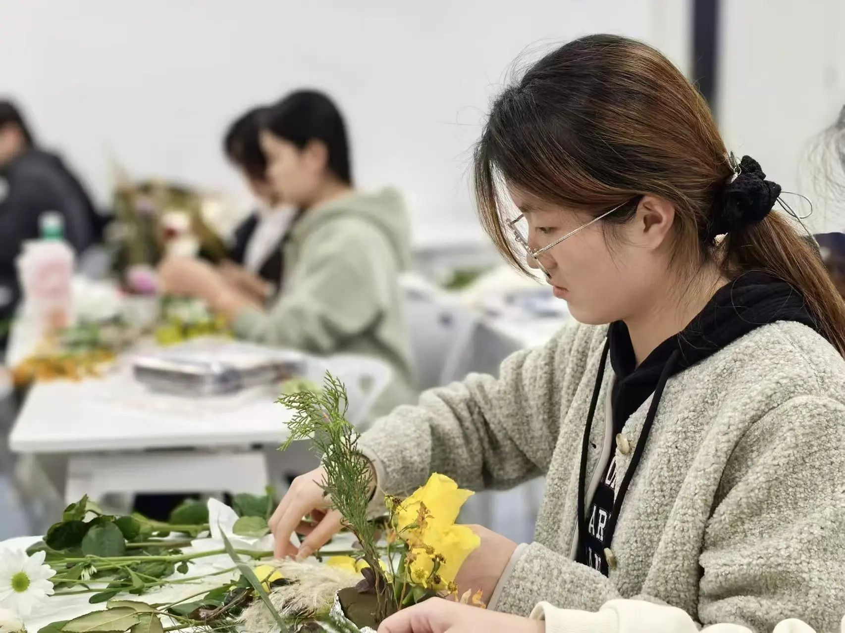 以此为基础,她面向全校开设了《植物与生活》这门公共选修课程,课上开展沉浸式插花、押花,利用花材制作书签、香包,及植物非遗手作项目——蓝染、拓印等活动,让学生在实践中收获情绪疗愈。如此多样化的教学方式,广受学生欢迎,更丰富了校园课程体系。
