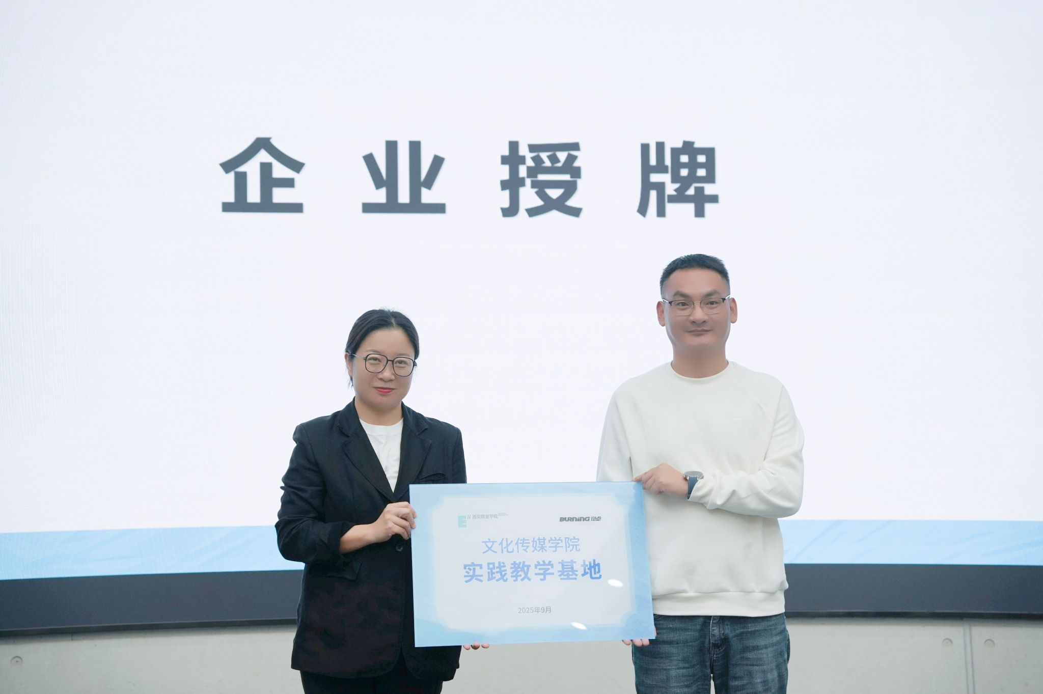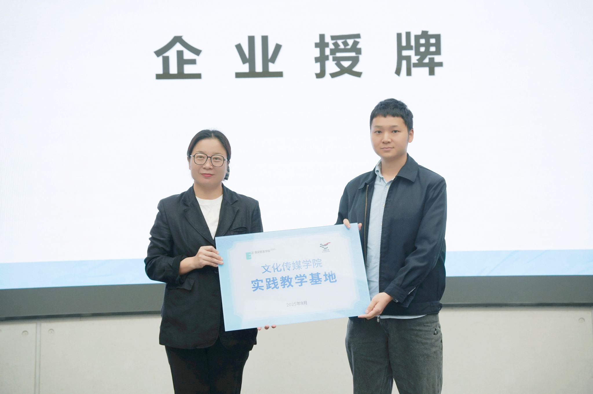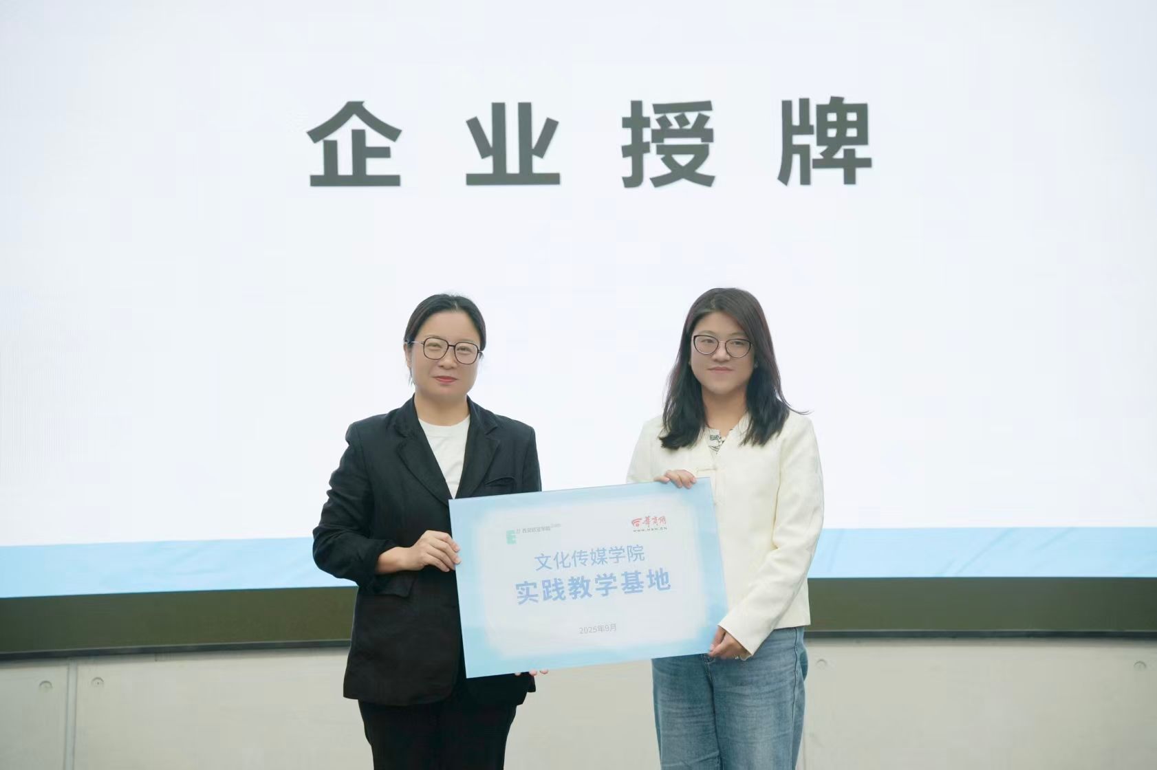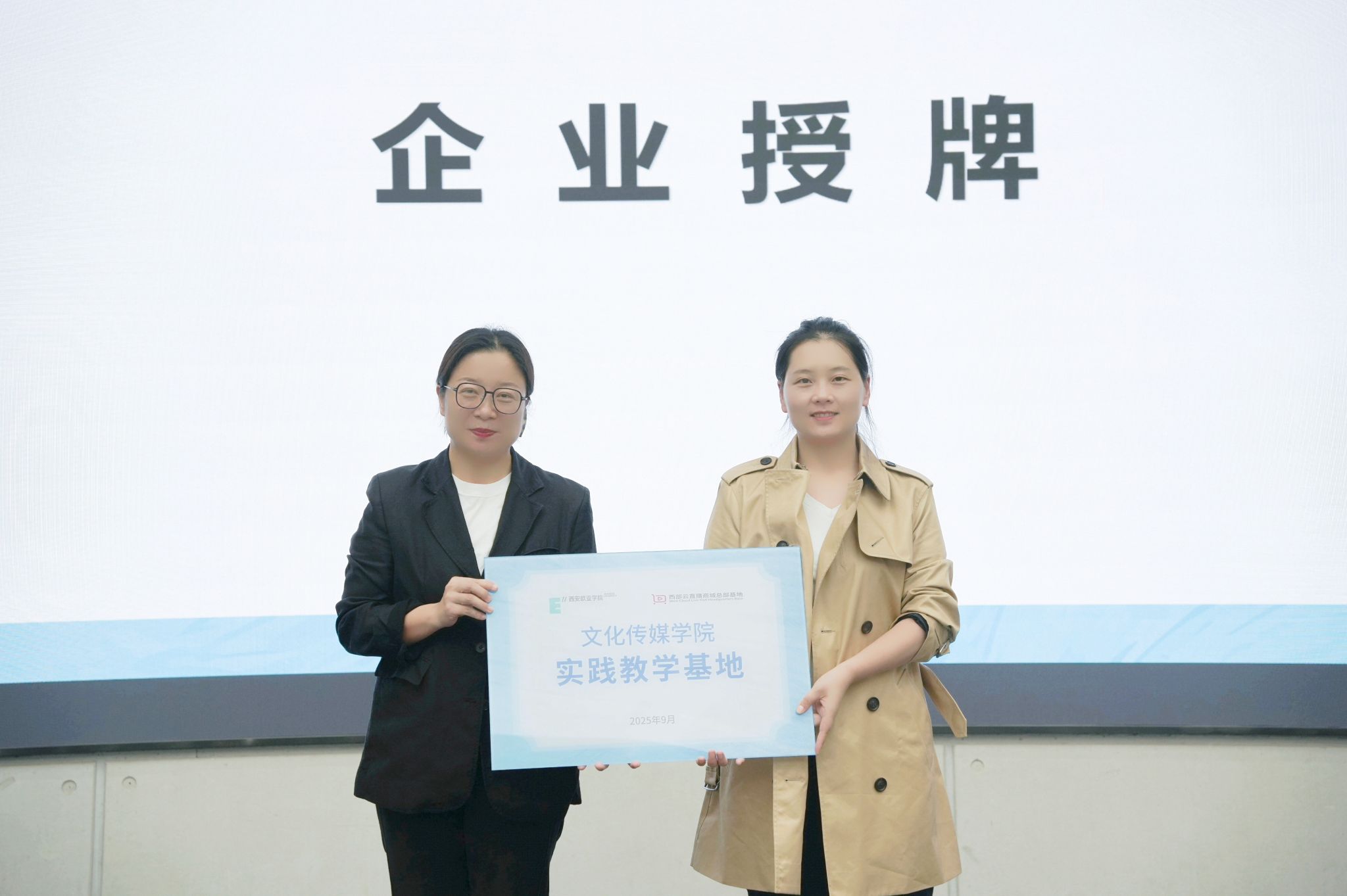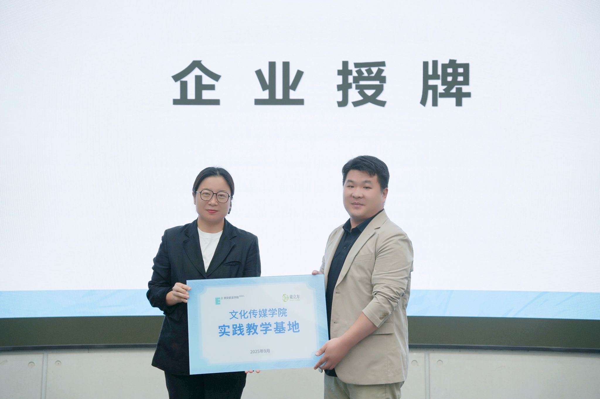 在授牌仪式上,文化传媒学院副院长曹小娟依次向北京童立方文化品牌管理有限公司、陕西秦之泉饮品集团销售有限公司、西安华商网络传媒有限公司、浙江燃点创新影视科技有限公司、华商传媒风华年文化发展有限公司共五家企业授予“实践教学基地”牌匾,为学生构建起直达行业现场的稳定实践平台。学院将持续与多领域雇主企业深化合作,拓展多元实践渠道,助力学生开阔视野、积累实战经验。