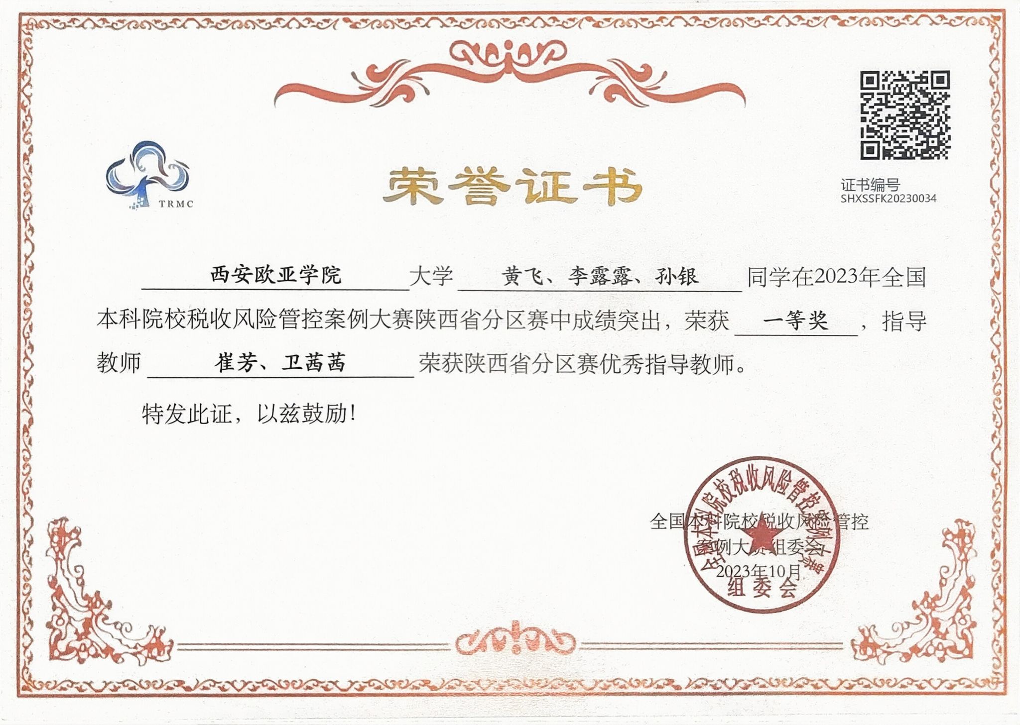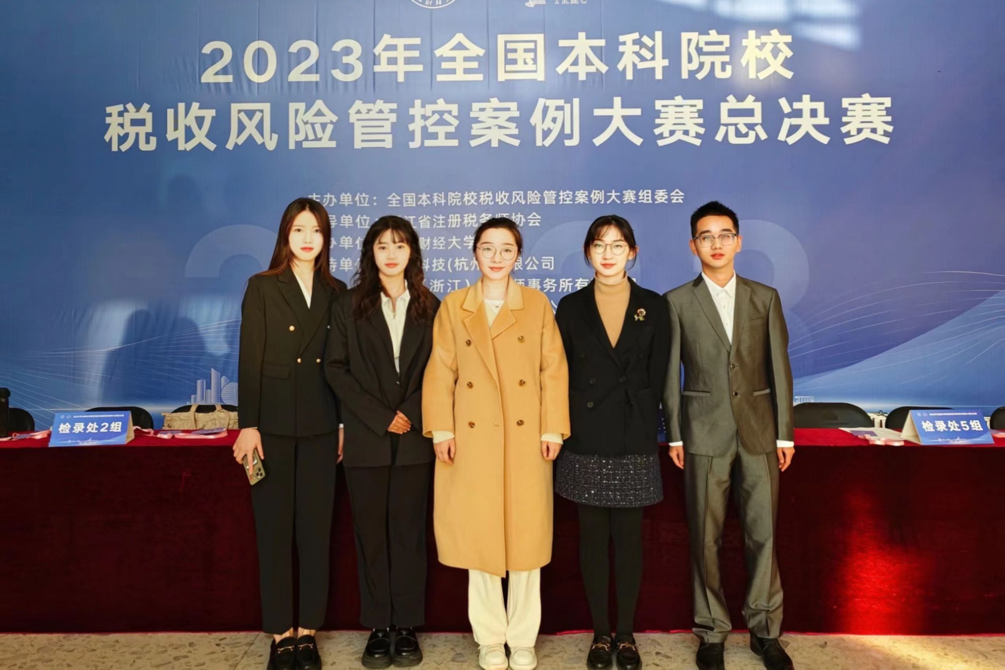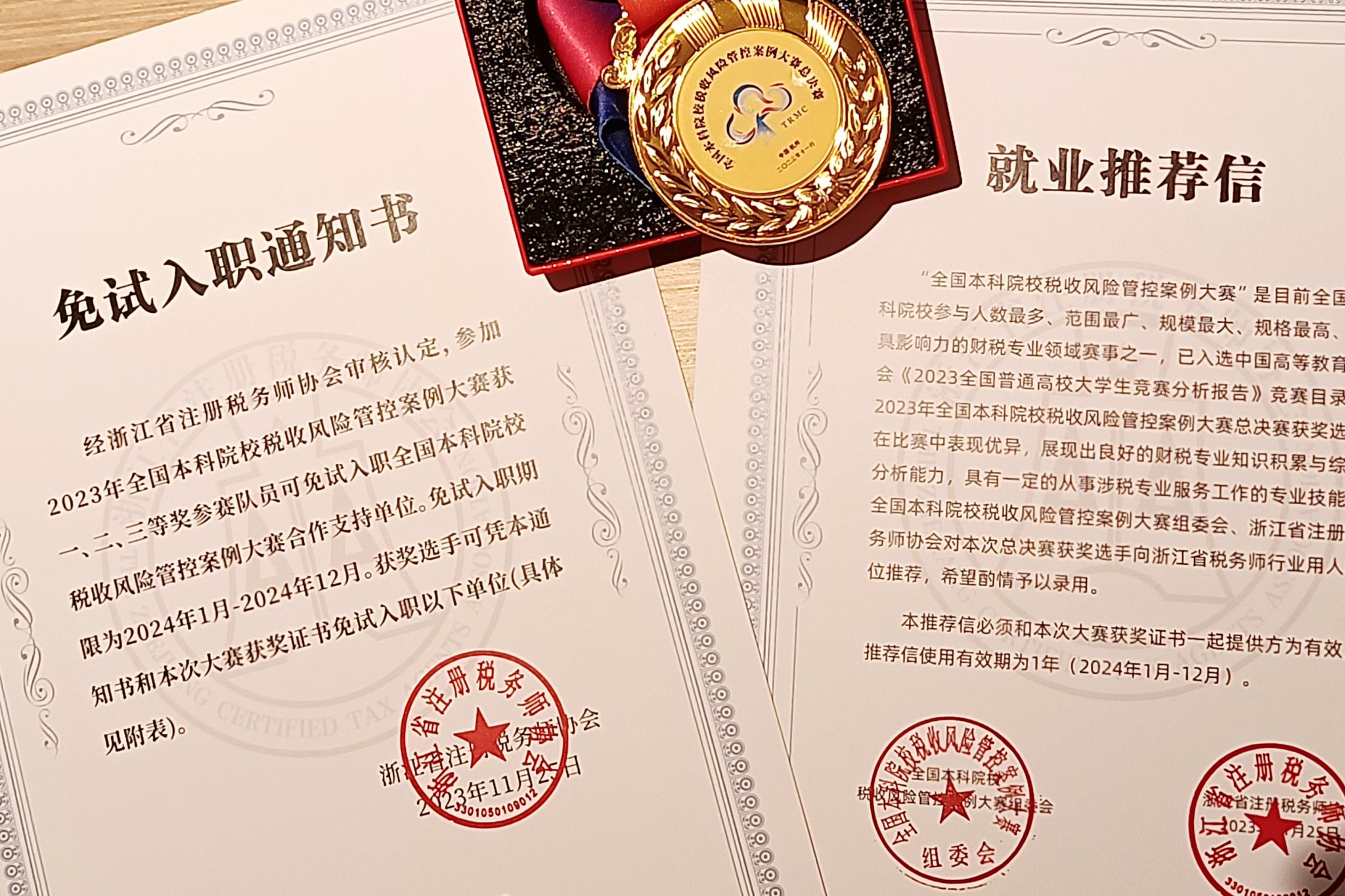 大三上学期,黄飞和李露露、孙银两位同学组队,参加了2023年全国本科院校税收风险管控案例大赛,并以省赛一等奖的成绩晋级全国总决赛。竞赛内容为选取某一上市公司,通过市场调研和公司财务年报分析,结合相关政策法规及税收理论,为企业提出有效的风险防控方案和问题解决对策建议。在崔芳和董瑜伦老师的指导下,他们前后修改了20多稿案例汇报方案。2023年11月25日,在杭州的决赛现场,黄飞和团队成员对案例的税务风险筛查依据、税务风险结果及税务处理方式等内容一一作了汇报,最终他们收获三等奖,还收到了大赛组委会发出的就业推荐信和面试入职通知书。这意味着他们有机会在毕业时得到浙江省税务师行业用人单位的优先实习和录用机会。