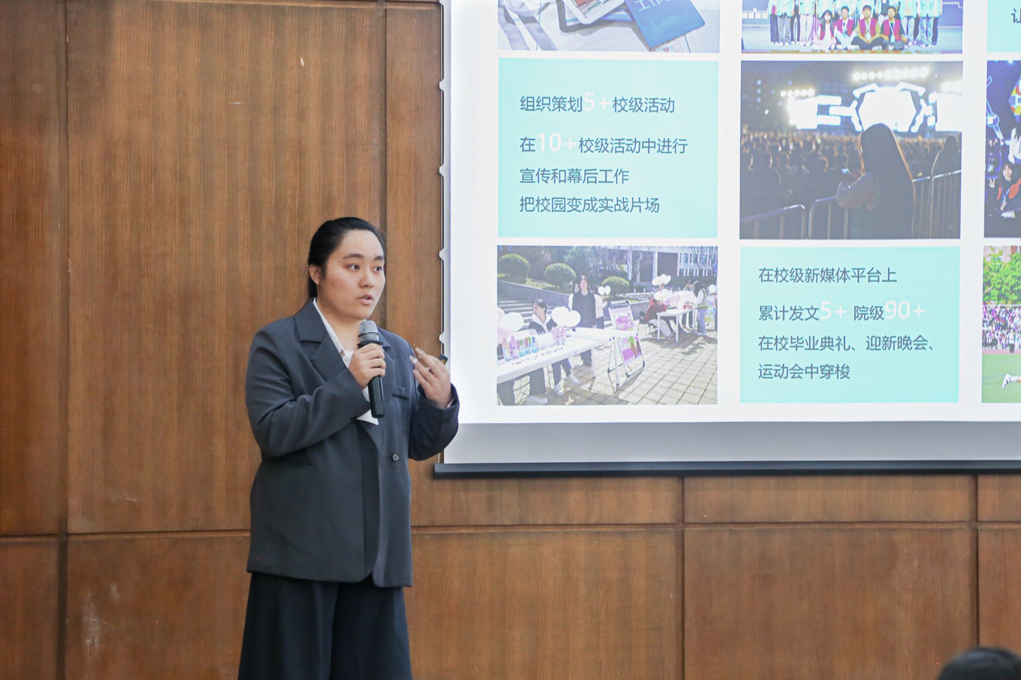 在随后的分享环节,来自会计金融学院、数据科学学院、工商管理学院、文化传媒学院、艾德艺术设计学院、人文教育学院、人居环境学院、信息工程学院、职业教育学院的9位候选人代表依次登场。他们结合自身经历,生动讲述了在欧亚“以学生为中心”教育理念下的成长与蜕变。他们的故事各异,但共同展现了我校学子在专业学习、学科竞赛、技能打磨、公益服务及创新创业等多个维度上的卓越表现与深刻思考,立体化地呈现了我校高素质应用型人才培养的丰硕成果。