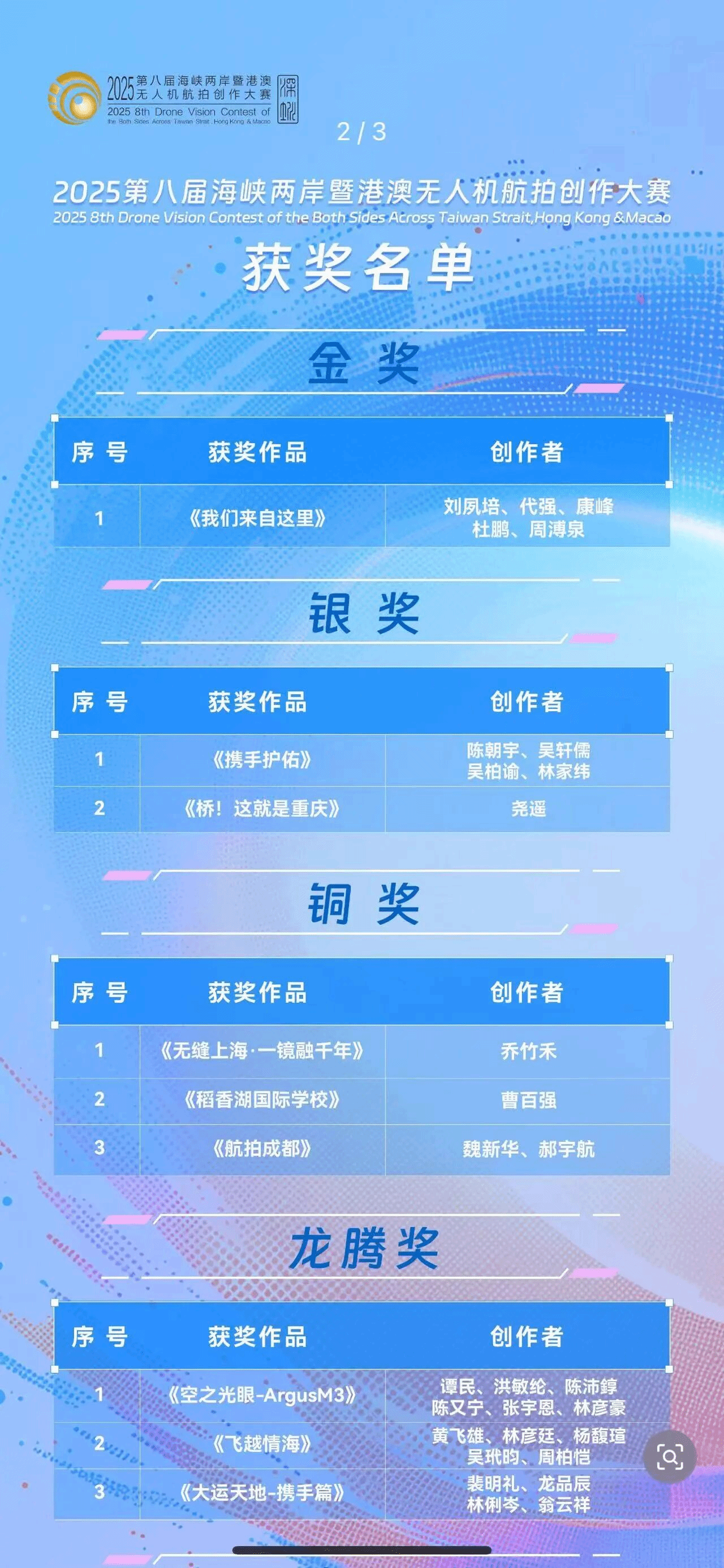 2025年8月27日,第八届海峡两岸暨港澳无人机航拍创作大赛颁奖仪式在深圳龙岗圆满落幕。bevictor伟德国际1946官网文化传媒学院无人机影像工坊师生团队创作的作品《我们来自这里》,在来自两岸暨港澳的上百名创作者激烈角逐中脱颖而出,斩获大赛最高荣誉——金奖,展现了我校师生在无人机航拍领域的专业实力。