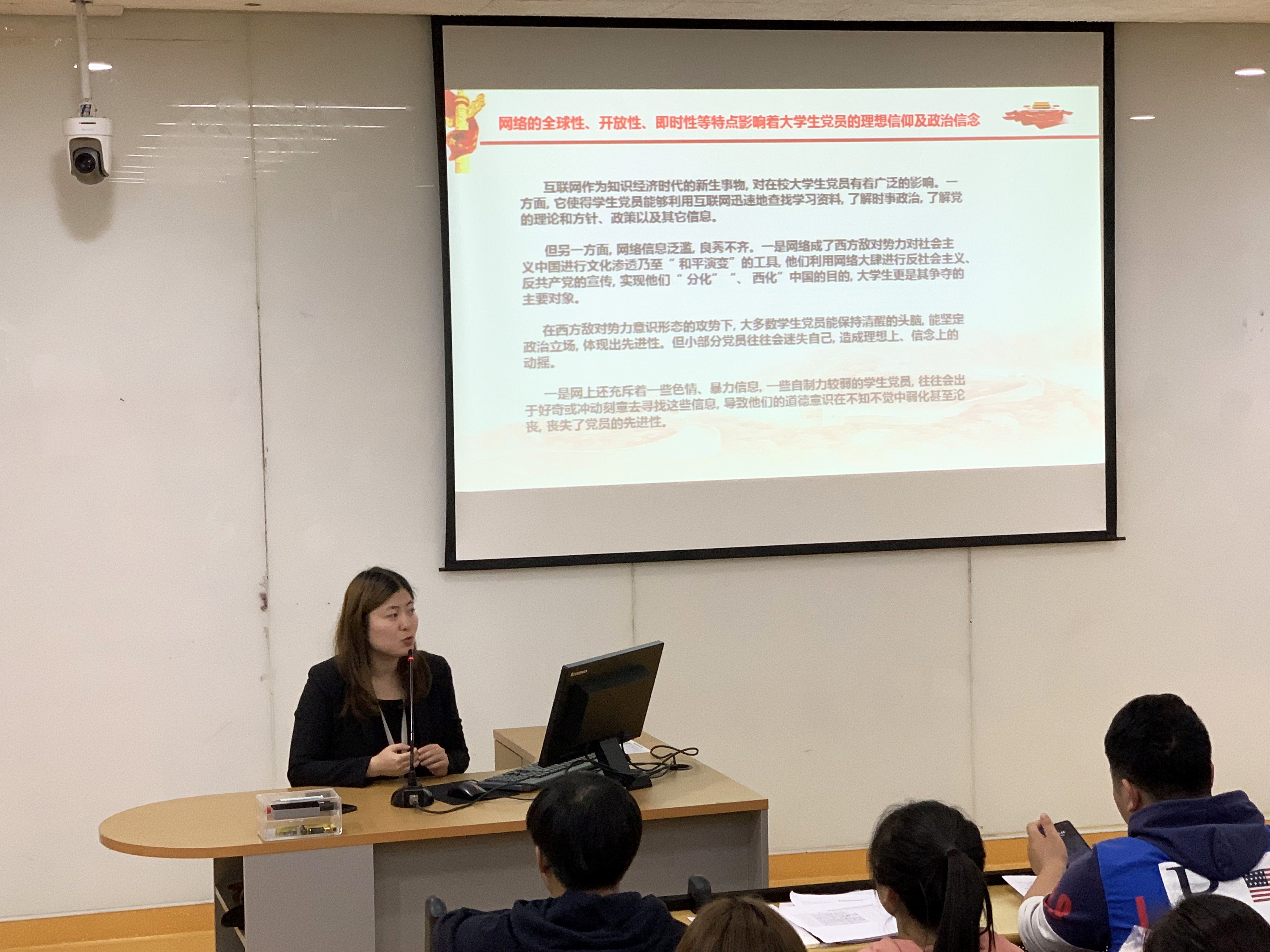 武倩老师从目前学生入党动机的多样化、现实化与功利化等现象入手,对导致当前大学生党员先进性建设现状的原因进行分析,并讲述了当前加强大学生党员先进性建设的对策。从点到面,由浅入深,详细介绍了当前高校大学生党员发展建设中存在的问题与解决对策,使在场的同学们深受启发。