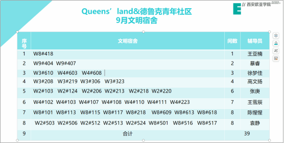 接下来到了激动人心的表彰环节,本次文明宿舍评选结合了社区、公寓和大联查三方数据,按月选出了优秀率大于等于75%的优秀宿舍。本月社区共有39间宿舍获得月度文明宿舍荣誉称号。