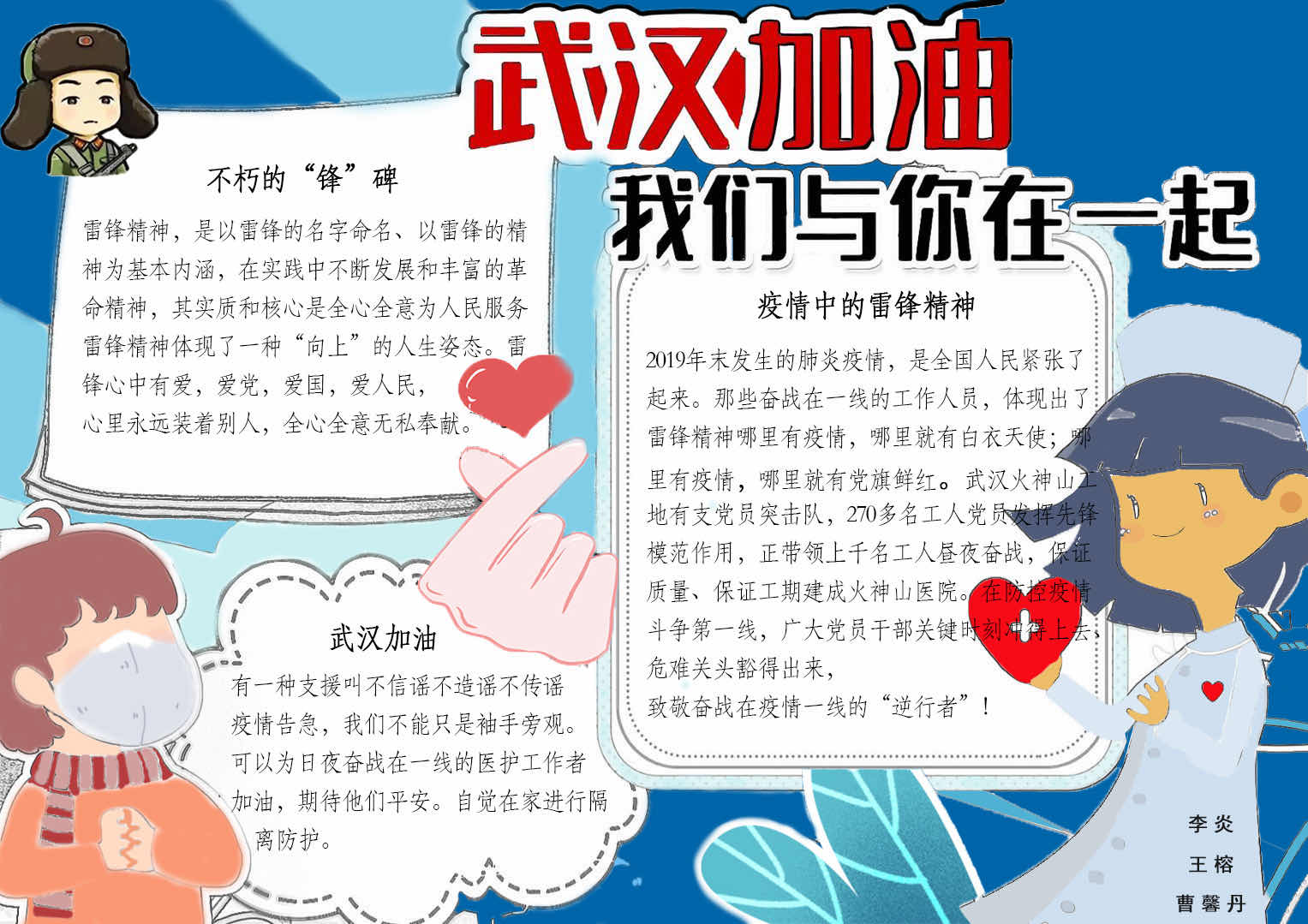 此次活动征集的手抄报内容丰富、图文并茂、标新立异、主题突出,每位作者都将雷锋精神与发生在疫情防控前线的英雄事迹完美结合,并向大家介绍了疫情防控的“预防小贴士”,同时也向奋战在一线的最美“逆行者”表达敬意。