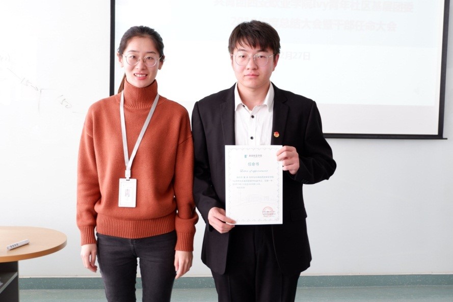 随后,Ivy青年社区主管助理田甜老师上台宣读了《关于2019-2020年度Ivy青年社区基层团委学生干部任命的决定》,并由姚新颖老师和李停老师分别为基层团委副书记曹涛同学和陈璟蕾、孟天奇、宋振西等7名同学颁发了任命书。