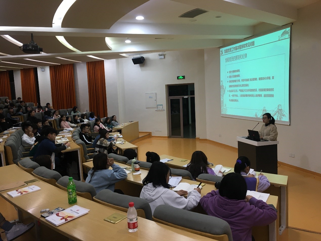 马丹书记从“党员发展、《发展党员工作细则》学习以及如何贯彻细则”三个方面展开党课的讲座。首先,她从发展党员过程中5个阶段25个环节进行了详细的讲解,就每一流程中涉及的阶段任务进行阐述。其次,她以学习目标为引详细解读了《中国共产党发展党员工作细则》的主要内容以及特点,并从党支部、基层党委和个人三个层面强调了关注时间概念。最后,围绕“党员发展过程中如何贯彻细则”这一问题,马丹书记提出了对发展党员的要求:第一,在思想上做到“三个认清”;第二,在工作上做到“三个更实”;第三,在政策把握上做到“三个搞好”。