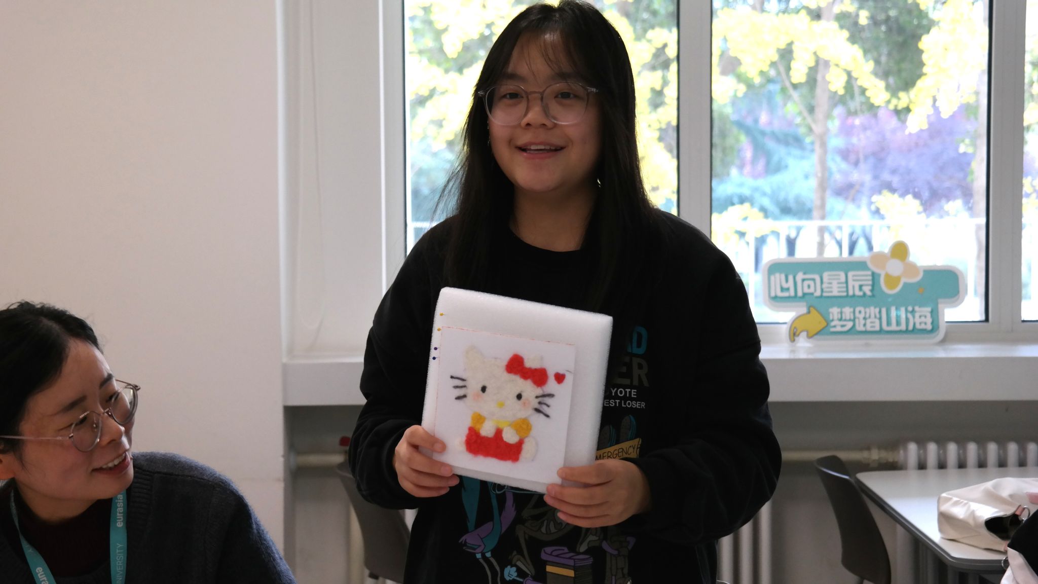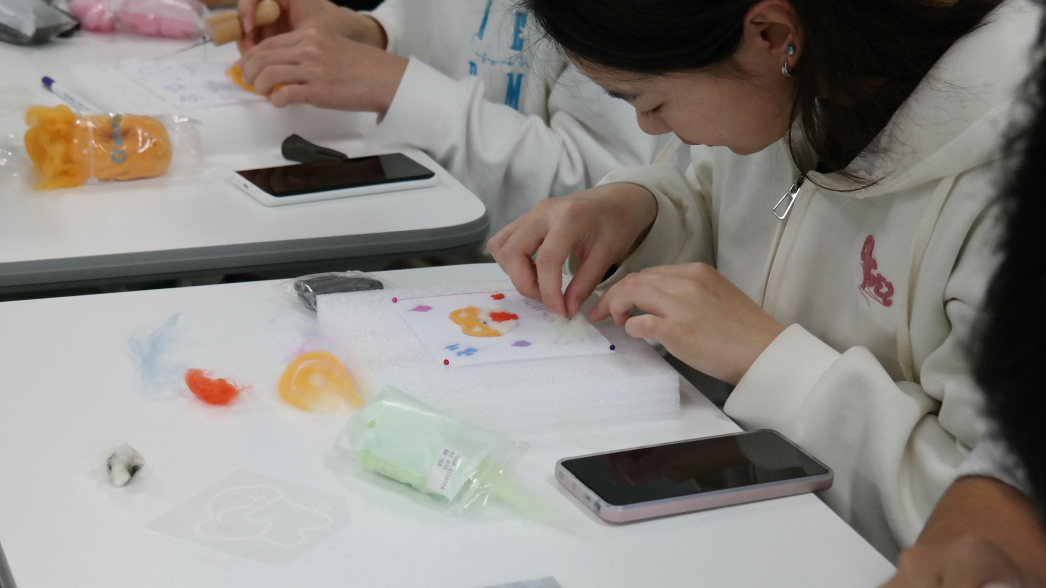 沉浸式创作的过程,像是给心灵按下了“暂停键”。大家暂时放下学业与工作的压力,将注意力完全集中在手中的毛毡上,每一次戳针都格外专注。有同学说:“平时总觉得心里乱糟糟的,但刚才盯着毛毡一点点成型时,脑子里什么都没想,特别放松。”更让人惊喜的是,当看着自己的作品从一堆零散的羊毛,变成可爱的动物、精致的挂件时,每个人脸上都露出了成就感满满的笑容——这种“亲手创造”的快乐,成了最治愈的情绪良药。