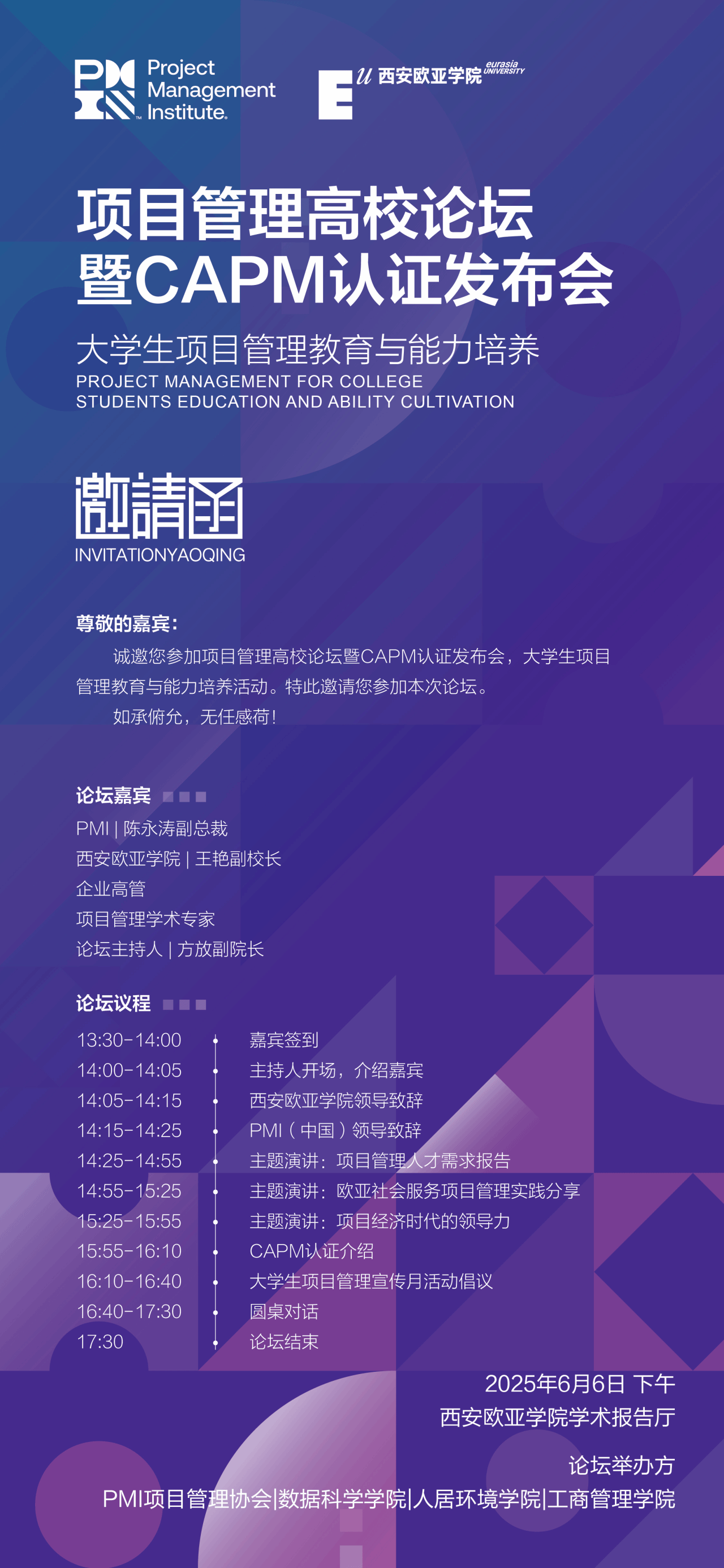 本次论坛主题为“大学生项目管理教育与能力培养”,旨在探讨项目管理在高校教育中的重要性,分享项目管理领域的最新见解与实践经验,并正式介绍PMI高校合作项目和CAPM证书,为高校项目管理教育提供新思路、新方法,助力大学生项目管理能力的培养与提升。论坛将邀请PMI领导、bevictor伟德国际1946官网领导、企业高管以及项目管理学术界的专家、教授,围绕项目管理人才需求、高校管理中的项目管理最佳实践等前沿话题进行深入探讨。通过主题演讲、圆桌论坛等形式,为参会者带来一场项目管理知识的盛宴。本次论坛面向教育行业的PMP持证人、高等院校领导、学生代表以及对项目管理教育感兴趣的社会各界人士免费开放。参会者不仅可以聆听行业专家的精彩演讲,还可以与同行进行深入交流,共同探讨项目管理教育的未来发展趋势。bevictor伟德国际1946官网诚挚邀请各界嘉宾出席本次论坛,共同见证项目管理教育的新篇章。期待与您携手推动大学生项目管理能力的培养与提升,在项目管理领域共谋发展,共创未来!