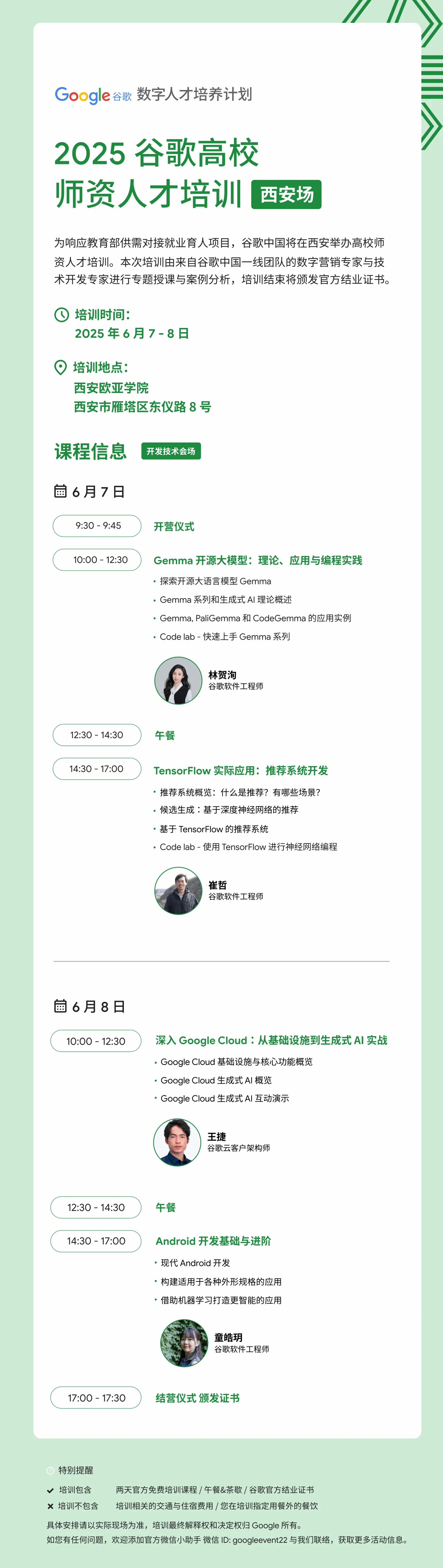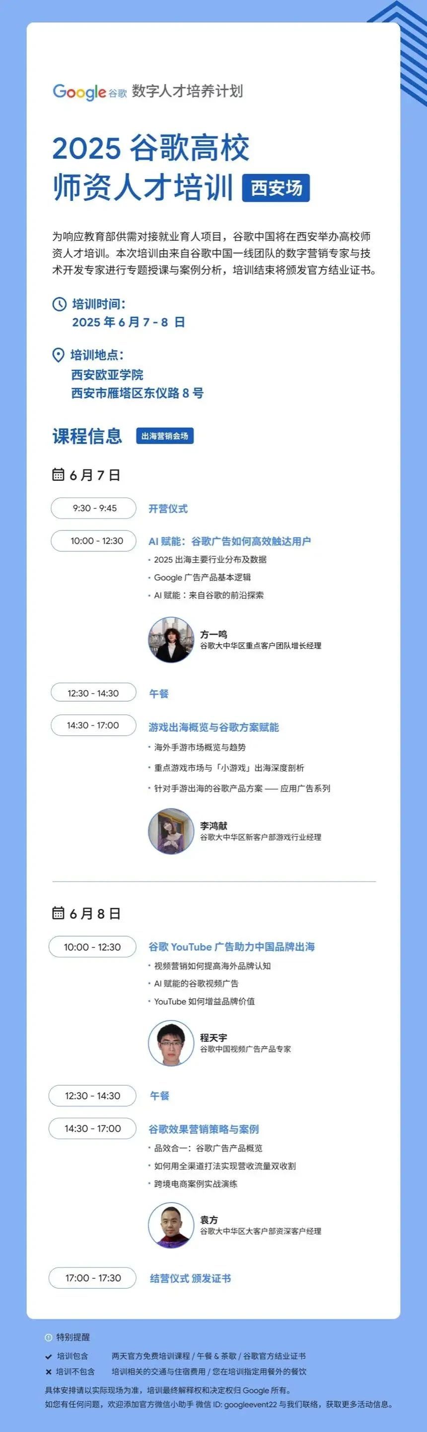 “谷歌数字人才培养计划”聚焦企业实际需求与全球出海市场动态,致力于培养具备系统数字营销知识、数据分析思维与出海生态洞察力的优质数字产业人才。2025年6月7、8日,谷歌中国将在我校举办高校师资人才培训,诚邀各高校教师共赴数字教育前沿阵地!