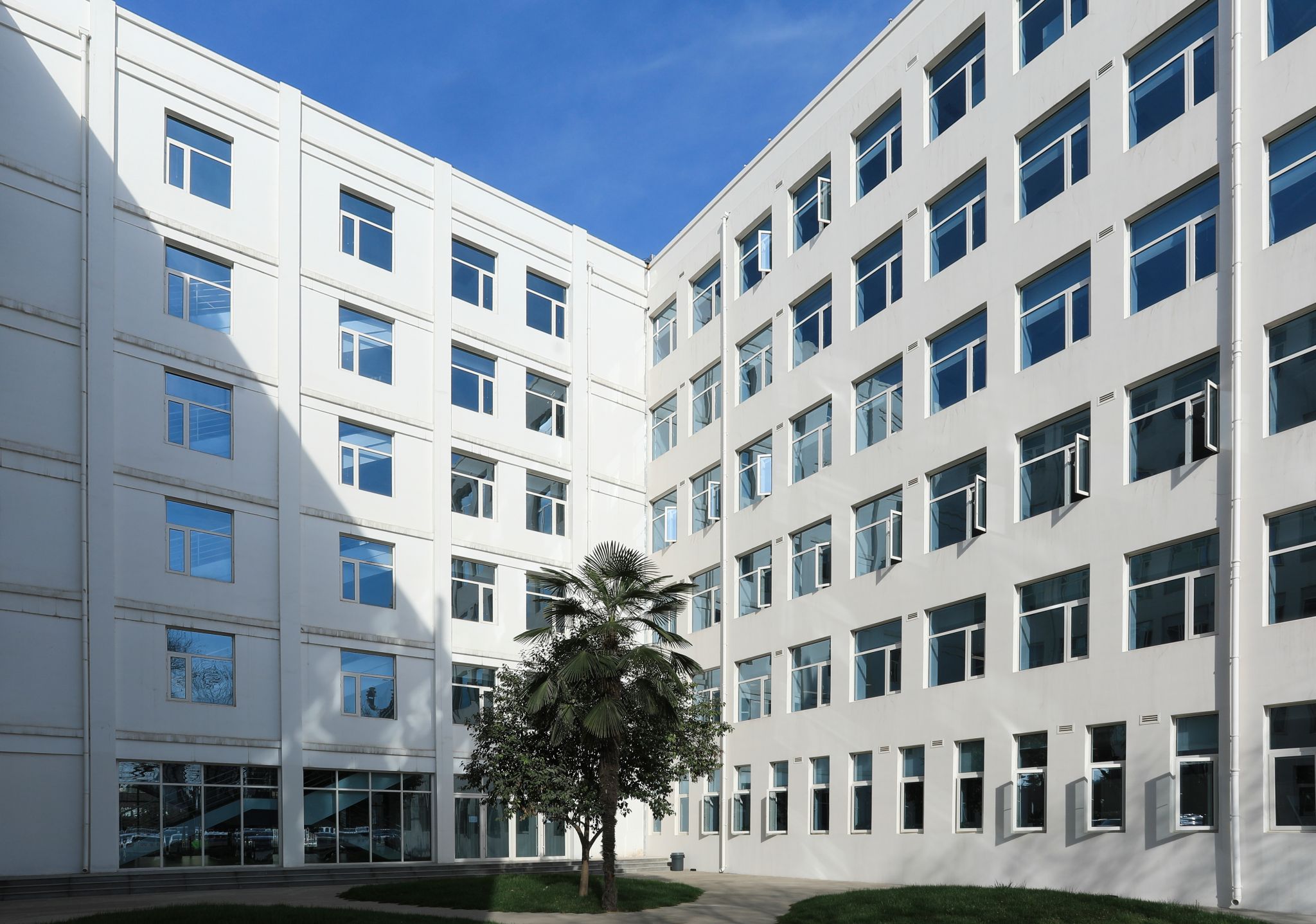 南区教学楼位于行政中心西侧,与北侧的联体教学楼共同围合起欧亚的核心公共空间。其外立面用红色面砖与白色涂料,辅以灰色面砖和玻璃材质,形成具有立体构成意味的建筑风格。在空间上,采用了模数化的开窗设计,在红、白、灰体块的开窗方式各具变化的同时,又使各部分统一为一个有机的整体。楼宇整体呈回字形,采用首尾相连的合院式布局组织起艾德艺术设计学院、文化传媒学院、数据科学学院和会计金融学院四大分院的教学楼群。