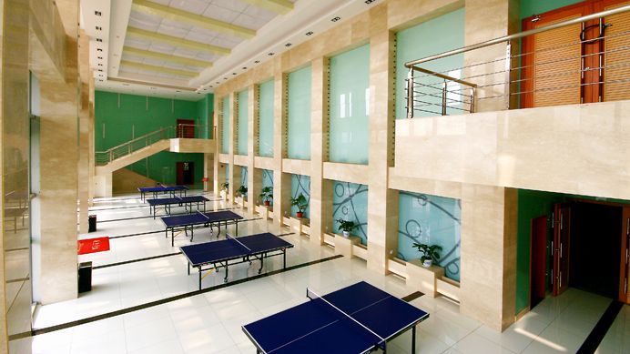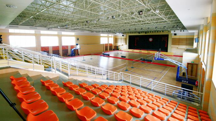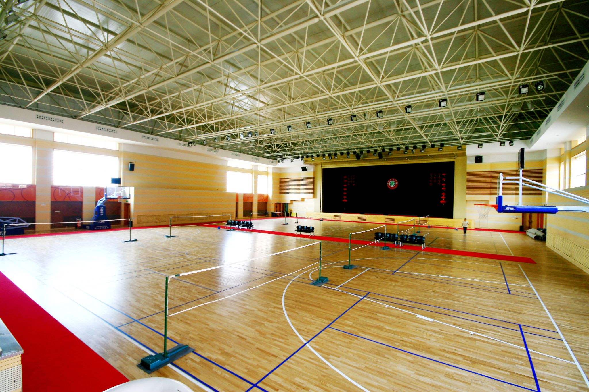 室内体育馆建筑面积4130平米,可同时容纳2000余人参加各类大型活动,是学校举办各种体育赛事、文艺演出、会议、体育课程训练的综合性场馆。体育馆分为大厅、看台、训练场、舞台及负一层五个区域,内有乒乓球台5个、动感单车房一个、标准篮球场2块、羽毛球场8块、健身房1个。